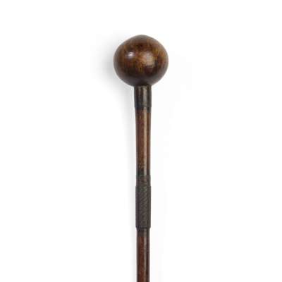 carved wood, the knobkerrie with bulbous head and wire binding along the shaft, the assegai with hide binding below the blade