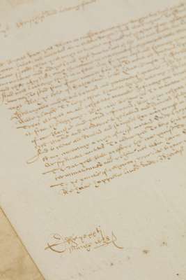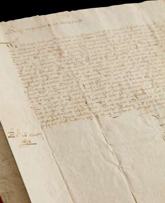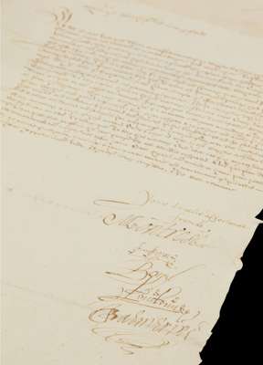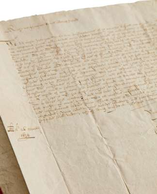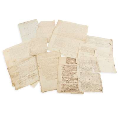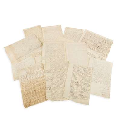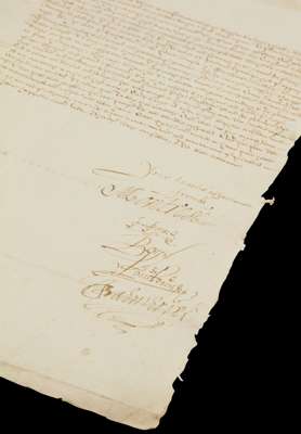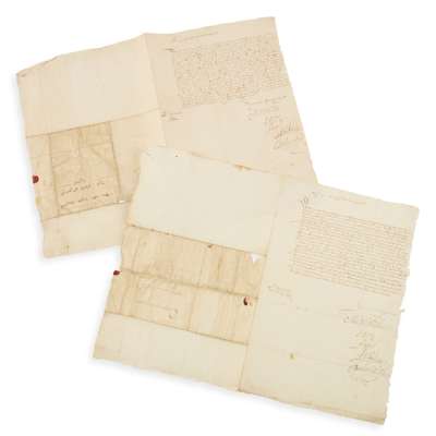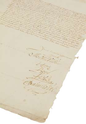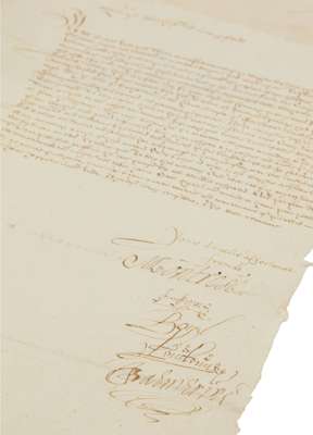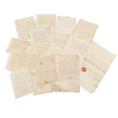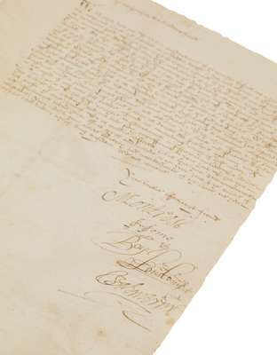 Documents concerning the 12th Baron, 1611-1643: a quantity of documents, mainly legal and financial, also including two signed copies of a letter from the leaders of the Covenanting party (one addressed to “The richt worfull the Laird of Perk, Theis” and the other “To the richt worshipfull the Laird of Kilraak, Theis", asking the recipients to “repair to Edinburgh with all convenient speede, that you micht be truelie informed of the estait of our effaires, and give your concurrence and advyce how these innovationes of the Service Booke, His Comission, Canons, and other abusis, so much threatning the overthrow of religioun and law, micht be removed…”, dated 26th March 1638, each 23 lines on paper, signed by Montrose, Boyd, Home, Loudon and others, each 20 x 31cm [Rose, Shaw & Innes p.320];