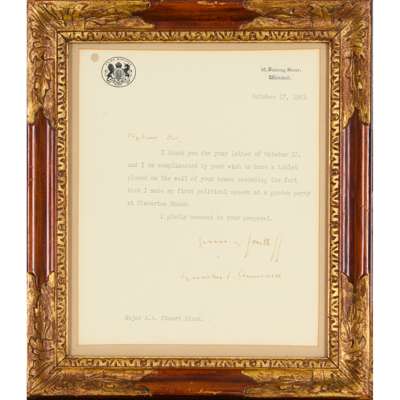 Single sheet of 10 Downing Street stationery, with Churchill's autograph inscription ‘yours faithfully Winston S. Churchill’ at foot and his autograph salutation ‘My dear Sir’ to head, the letter reading ‘I thank you for your letter of October 12, and I am complimented by your wish to have a tablet placed on the wall of your house recording the fact that I made my first political speech at a garden party at Claverton Manor. I gladly consent to your proposal’, mounted, framed and glazed, mount aperture 22.5 x 18.5cm, verso with label comprising section of Claverton Manor letterhead inscribed ‘here Winston Spencer Churchill on July 26th 1897 made his first political speech’), punch-hole to upper left corner not affecting text