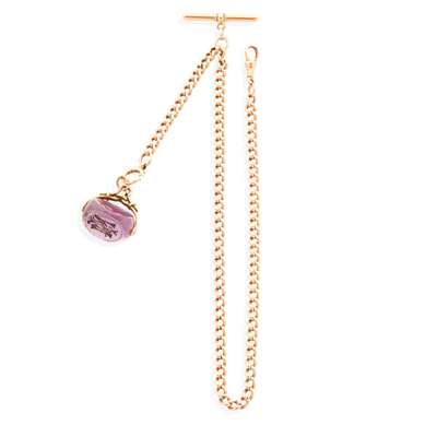 Composed of curb links, with T-bar suspension and facetted and engraved amethyst fob, unmarked