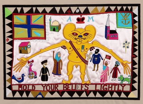 Within Recipe for Humanity, 2005, Perry further explores concepts of God and religion. Crafted in the style of a traditional sampler it features a joyous scene of Adam and Eve in the Garden of Eden, inspired by American Folk Art. However rather than include traditional religious references, Perry disrupts convention by instead quoting renowned psychotherapist Irwin D. Yalom’s ‘Four Givens of Life’: you will die, you are alone, there isn’t a God and life is meaningless apart from the meaning you give it. As a result, the viewer is attracted by the colourful imagery, yet provoked by its accompanying commentary.
