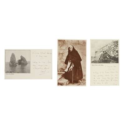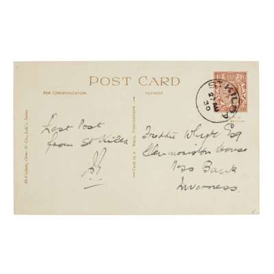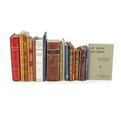 Macaulay, Kenneth A Voyage to, and History of, St. Kilda. Dublin: James Hoey, 1765. 12mo, contemporary calf, some marginal soiling [ESTC T76273]; Martin, Martin A Voyage to St. Kilda. London: R. Griffith, 1749. Third edition, 8vo, later half calf gilt, lacking map; [bound with] Amyntor and Theodora: or, The Hermit. London: Paul Valliant, 1748; and an 1818 copy; Macaulay, Kenneth Histoire de Saint-Kilda. Paris: Knappen, 1782. 8vo, three works in one volume, including von Staehlen, M.J. Relation du Nouvel Archipel Septenrional..., original wrappers, clamshell box; [Inchbald] Conirdan: or, the St. Kildians. London: Sherwood, Neely and Jones, 1817. 8vo, contemporary half morocco, one leaf torn with loss to text; Buchan, Alex A Description of Saint Kilda. Glasgow: John Wylie & Co., 1818. 12mo, half calf; and another copy, lacking the title; Seton, George St Kilda Past and Present. Edinburgh: William Blackwood and Sons, 1878. 8vo, modern red crushed quarter morocco gilt; Kearton, R. The Strange Life of Lone St. Kilda, in The Wide World Magazine, pp.69-77, October 1898. 8vo, modern quarter calf gilt, original wrappers bound-in; Mackenzie, J.B. Episode in the Life of the Rev. Neil Mackenzie at St. Kilda. Privately printed, 1911. 8vo, modern quarter calf gilt; Gibson, George The Tragedy of St. Kilda, in The Caledonian Medical Journal, pp.50-62, April 1926. 8vo, modern half calf gilt; MacDiarmid, John St Kilda and its Inhabitants. Edinburgh: William Blackwood and Sons, 1877. 8vo, bookplate of George Beveridge, modern quarter calf, loosely inserted photograph of a young girl on St Kilda; Miller, Walter J. St. Kilda, the Arcadia of the Hebrides... London: Elliot Stock, 1898. 8vo, original green cloth gilt; Smith, R. Angus A Visit to St. Kilda in "The Nyanza". Glasgow: University Press, 1879. 8vo, original brown cloth gilt; MacGregor, Alasdair Alpin A Last Voyage to St. Kilda. London: Cassell and Company, [1931]. 8vo, signed and inscribed by the author, dust-jacket; Wiglesworth, J. St. Kilda and its Birds. Liverpool: C. Tinling & Co., 1903. 8vo, original boards; Connell, Robert St. Kilda and the St. Kildians. London: Hamilton, Adams, & Co., 1887. 8vo, original blue cloth gilt; Fisher, James & George Waterson The Breeding Distribution, History and Population of the Fulmar... offprint from the Journal of Animal Ecology, November 1941. 8vo, blue cloth gilt; [Archive] A collection of writings regarding St Kilda, including a copy of a list of "The quantity of fulmer [sic] oil received from the Crofters here", comprising an inventory of how much fulmar oil in pints has been given by each crofter to Neil Ferguson, the General Officer of St Kilda; several 19th century letters from St Kilda; a postcard depicting an elderly St Kildian woman, postmarked St Kilda 27 August 1930 and inscribed 'last post from St Kilda', send just before the evacuation of the island; a copy of a project entitled "Evacuation of St Kilda" undertaken by schoolgirl, Sheana Campbell; a typed journal of Hebridean cruises dating from the 1980s; and various typed notes regarding the island, probably collated by Mr John Mackenzie of the St. Kilda Club (19)