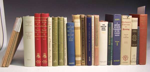 Heraldic influence on early printer's devices. The Elmete Press, 1978. Limited to 475 copies; Clair, C. Christopher Plantin. 1960, dust-jacket; Shaw, G. Printing in Calcutta to 1800. 1981; Hutt, A. Fournier, the compleat typographer. 1972, dust-jacket; Rostenberg, L. Literary, political, scientific, religious & legal publishing, printing & bookselling in England, 1551-1700. New York, 1965. 2 volumes; Todd, W.B. A directory of printers... 1800-1840. 1972, dust-jacket; Wolpe, B. Vincent Figgins type specimens. 1967, 2 copies; Hunt, C.J. The book trade in Northumberland and Durham to 1860. 1975, dust-jacket; Moxon, J. Mechanick exercises. 1962, edited by H. Davis & Carter, dust-jacket; Chappell, W. A short history of the printed word. 1972, dust-jacket; Heywood, J. A showing of type. Rob Run Press, 1974; Webb, K.G. Stanhope impressions, 1966; Shepard, L. John Pitts, ballad printer. 1969; Plant, M. The English book trade. 1965, dust-jacket; Bankes, H. Treatise on lithography. 1976; Watts. A. Technical progress in 19th century printing. 1983; Tebbel, J. A history of book publishing in the United States. 1972, volume 1 only; Clair, C. A history of printing in Britain. 1965; Armstrong, A.C. Bouverie Street to Bowling Green Lane. 1946; and 4 others (25)