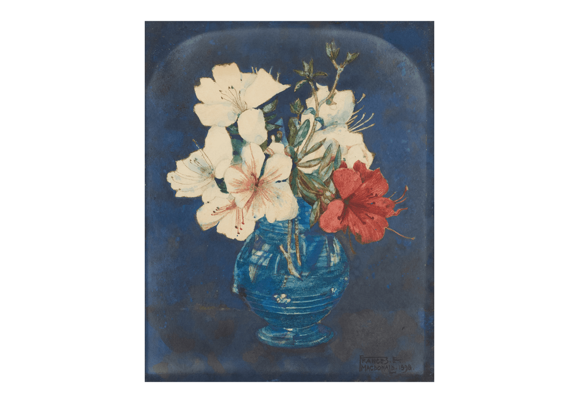 Born near Wolverhampton, Frances Macdonald MacNair moved with her family to Glasgow in 1890. She and her older sister, Margaret, later enrolled at Glasgow School of Art in 1891 where they met fellow students Charles Rennie Mackintosh and J. Herbert MacNair. By 1894 the Macdonald sisters had left the School of Art and established a studio where they made metalwork, embroideries, jewellery and craft items, often in collaboration with each other as well as MacNair and Mackintosh. Together they became known as ‘The Four’, developing international reputations for their designs.