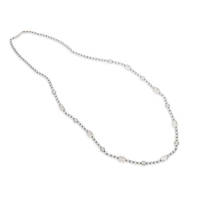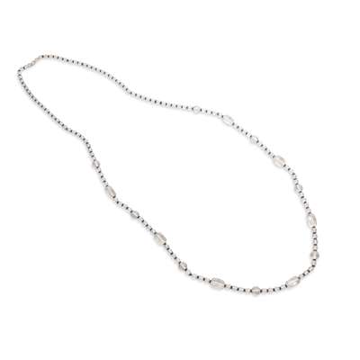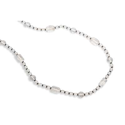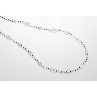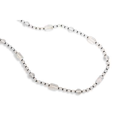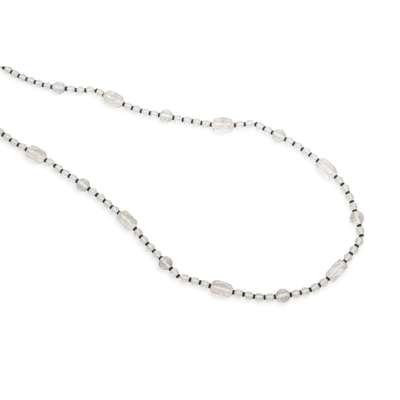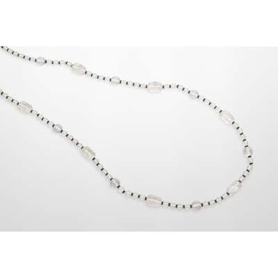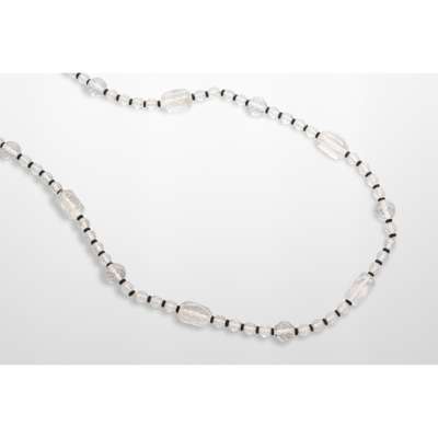 set with faceted beads, spaced by black roundels, interspersed with lozenge shaped glass beads carved with foliate patterns, a few black roundels deficient, length 121.7cm