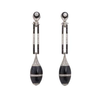 PAIR OF ONYX AND DIAMOND PENDENT EARRINGS