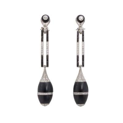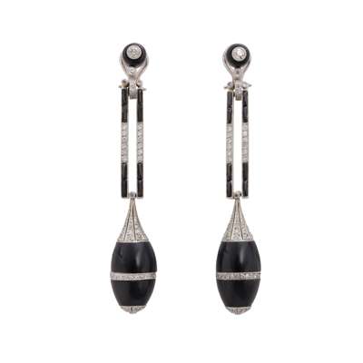 each elongated drop set old brilliant and brilliant-cut diamonds, alternating with calibrè-cut onyx, suspending a finely millegrain-set similarly-cut diamond and onyx orb drops, diamonds approx. 1.00 carat total, later clip and post fittings, length 6.3cm, cased