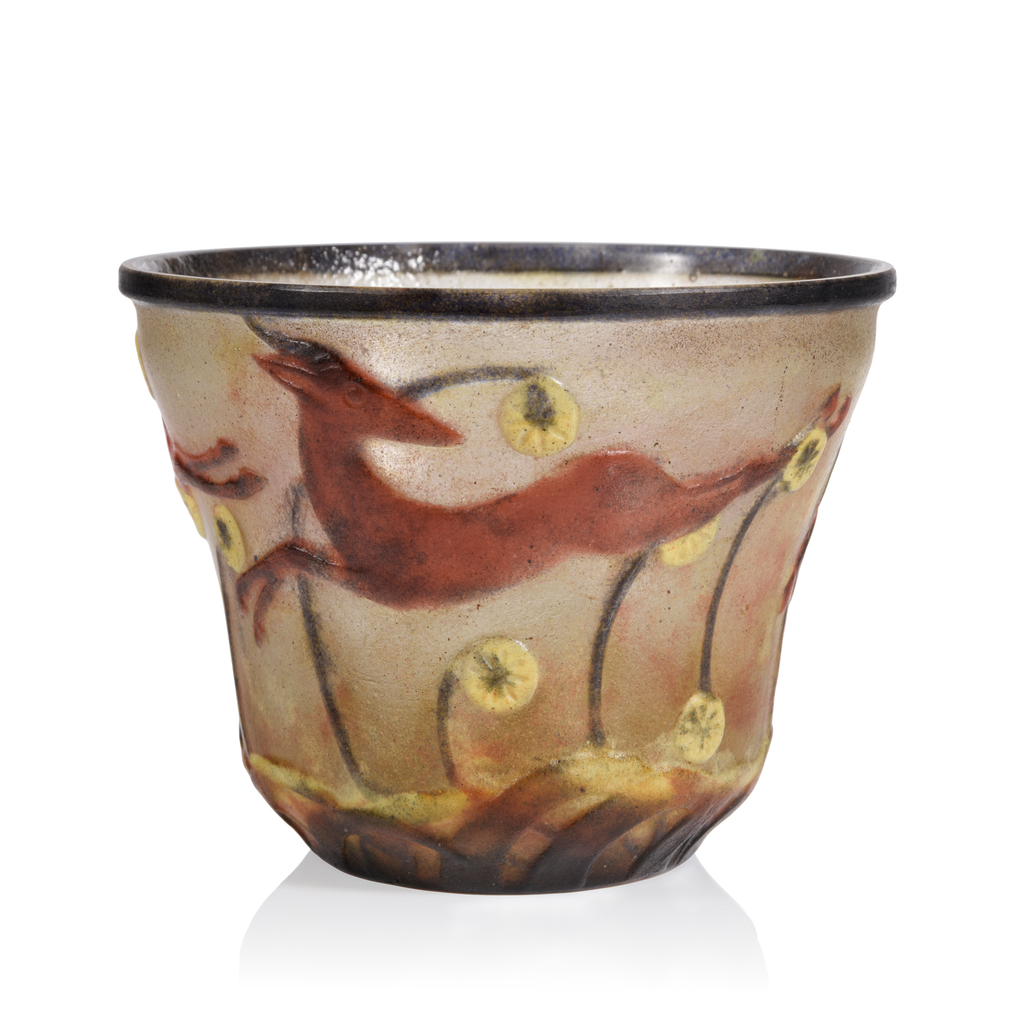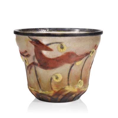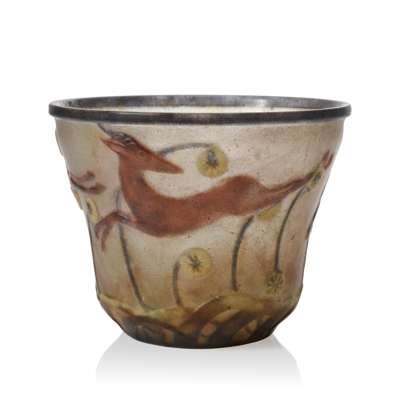 Gabriel Argy-Rousseau studied at the National School for Ceramics in Sèvres and then made porcelain teeth. However, he became captivated by the potential of pâte de verre and in 1920 established his own company Les Pâtes de Verre d’Argy-Rousseau. His initial ideas were formulated in drawings that were then transposed into plaster models painted with lacquer varnish then covered with wax. He used sectional moulds and his own recipe for pâte de verre comprising feldspar, kaolin, and boric acid ground into a powder, with metallic oxides being added for colour. The powder was mixed with water and the paste brushed into the mould before firing.