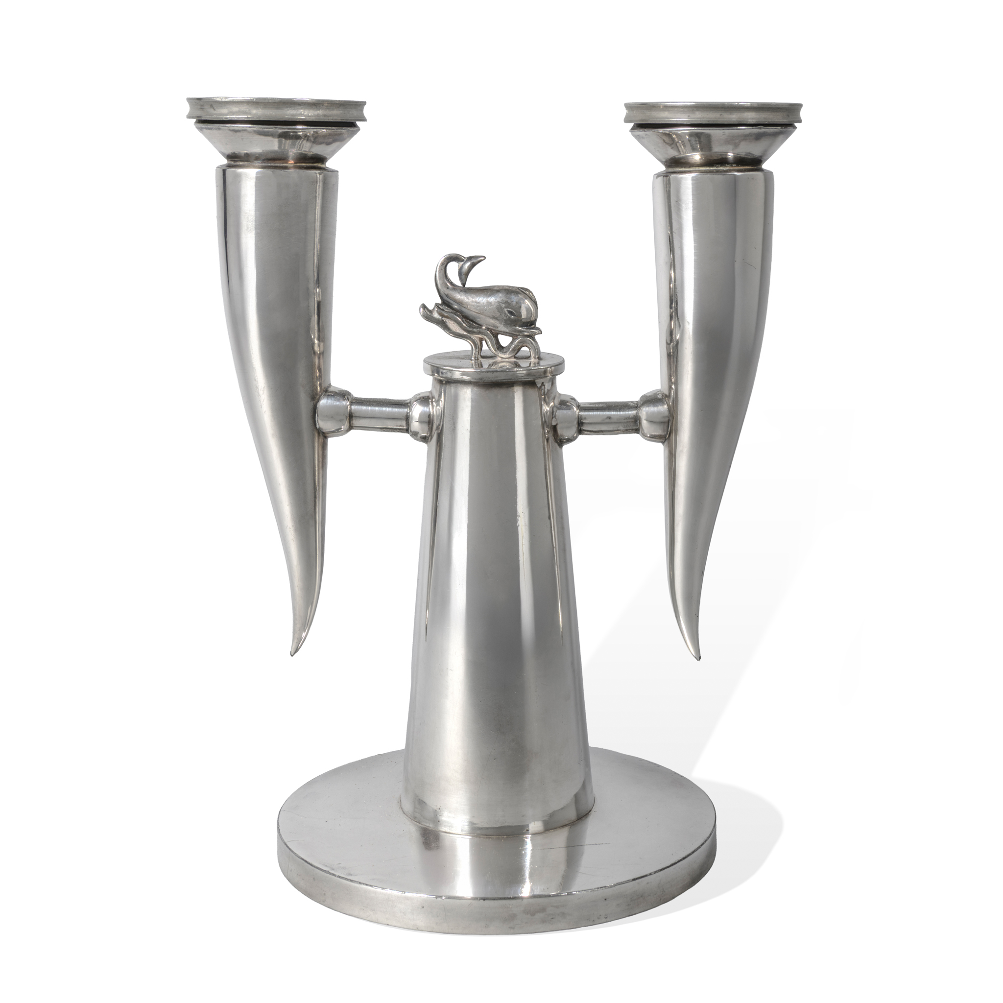 In 1928 Ponti worked on the Italian room for the 16th Venice Biennale, where he presented his Les Miriors et les Flèches collection also designed for Christofle. Amongst this was the Candèlabre-flèche or arrow chandelier (see lot 51), depicting two horns with a central arrow. It was created for the marriage of Tony Bouilhet, the head of Christofle, and Carla Borletti, Ponti’s niece. A variant was also created with a dolphin which went into production in 1931.