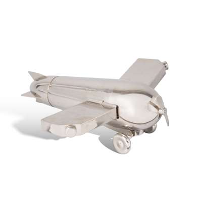 chromium plated metal, the fuselage containing screw top flask, cocktail shaker with strainer, the tail containing four 'tot' cups, funnel, corkscrew and stand, the 'wings' formed of removable hip flasks, and undercarriage wheels containing four stirring spoons