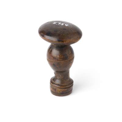 the wooden handle of baluster form with threaded detail, the circular brass matrix engraved with the crest of Robertson with motto 'Virtutis Gloria Merces'
