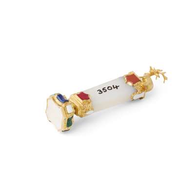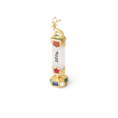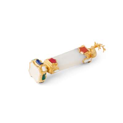 the facetted agate handle set to either end with applied hardstones of various shapes including lapis lazuli, malachite and bloodstone, with a finial modelled as a stag, the ornately chased gold collar set further with varying hardstones, to an escutcheon shaped agate matrix engraved with a baron's coronet above a cypher