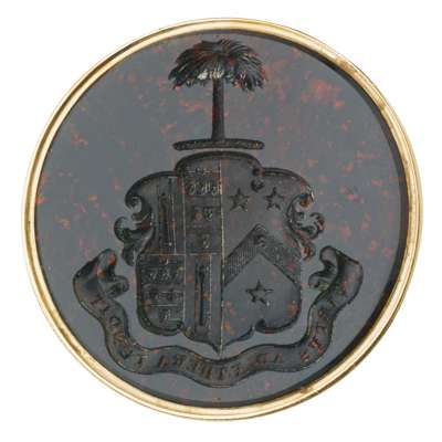 The arms as engraved upon the matrix are those of the family of Balfour impaling Gascoyne-Cecil. These armorial bearings undoubtedly commemorate the marriage of James Maitland Balfour of Whittingehame in the County of East Lothian and of Strathconan in the County of Rosshire (born 5th January 1820, died 23rd February 1856) and Lady Blanche Mary Harriet Gascoyne-Cecil (born 1825, died 16th May 1872).