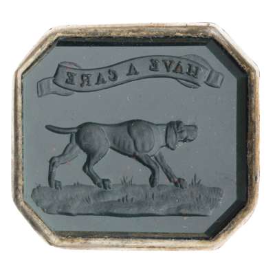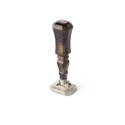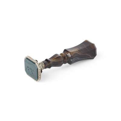the facetted brown banded agate, of baluster form, to a chased silver mounted collar with four acanthus scroll arms, the bloodstone matrix engraved with the crest and motto HAVE A CARE, presented in a fitted case, the base stamped for 'BURGER-LEVEQUE/ Graveur/ 64 PALAIS ROYAL 3