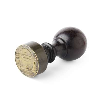 the turned wooden handle of baluster form, to a brass collar, the integral matrix with engraved transport depictions and 'GENERAL TERMINUS AND GLASGOW HARBOUR RAILWAY COMPANY 1846'