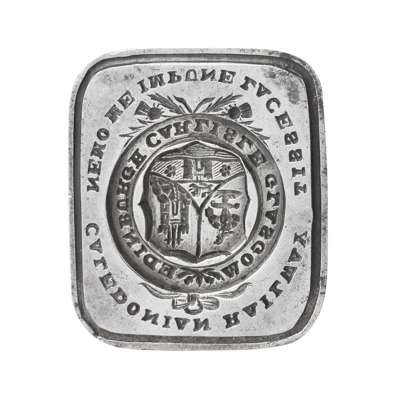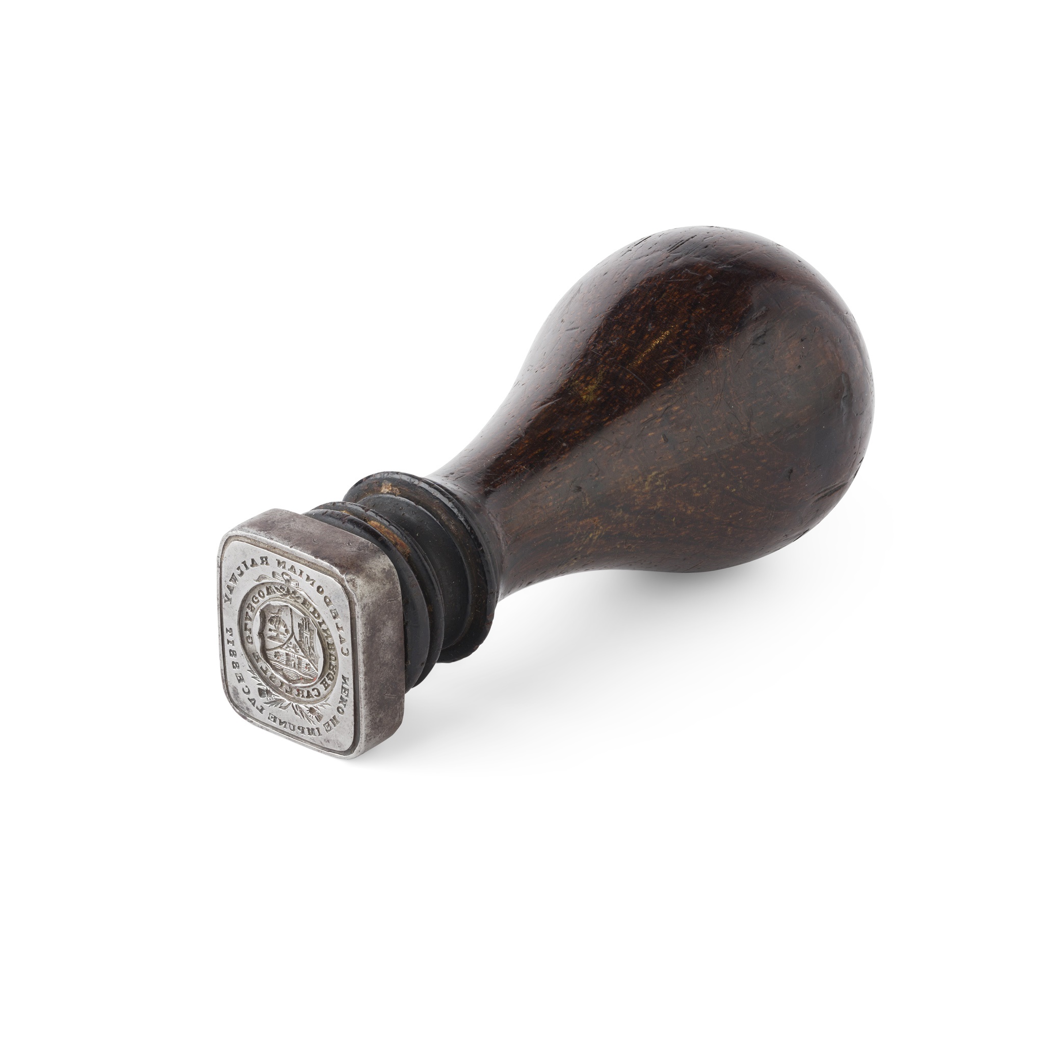 the turned hardwood handle with reeded lower section to a square steel matrix, engraved with armorial with garter and inscribed EDINBURGH CARLISLE GLASGOW, the whole surmounted by Caledonian Railway and motto Nemo Me Impune Lacasset below