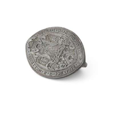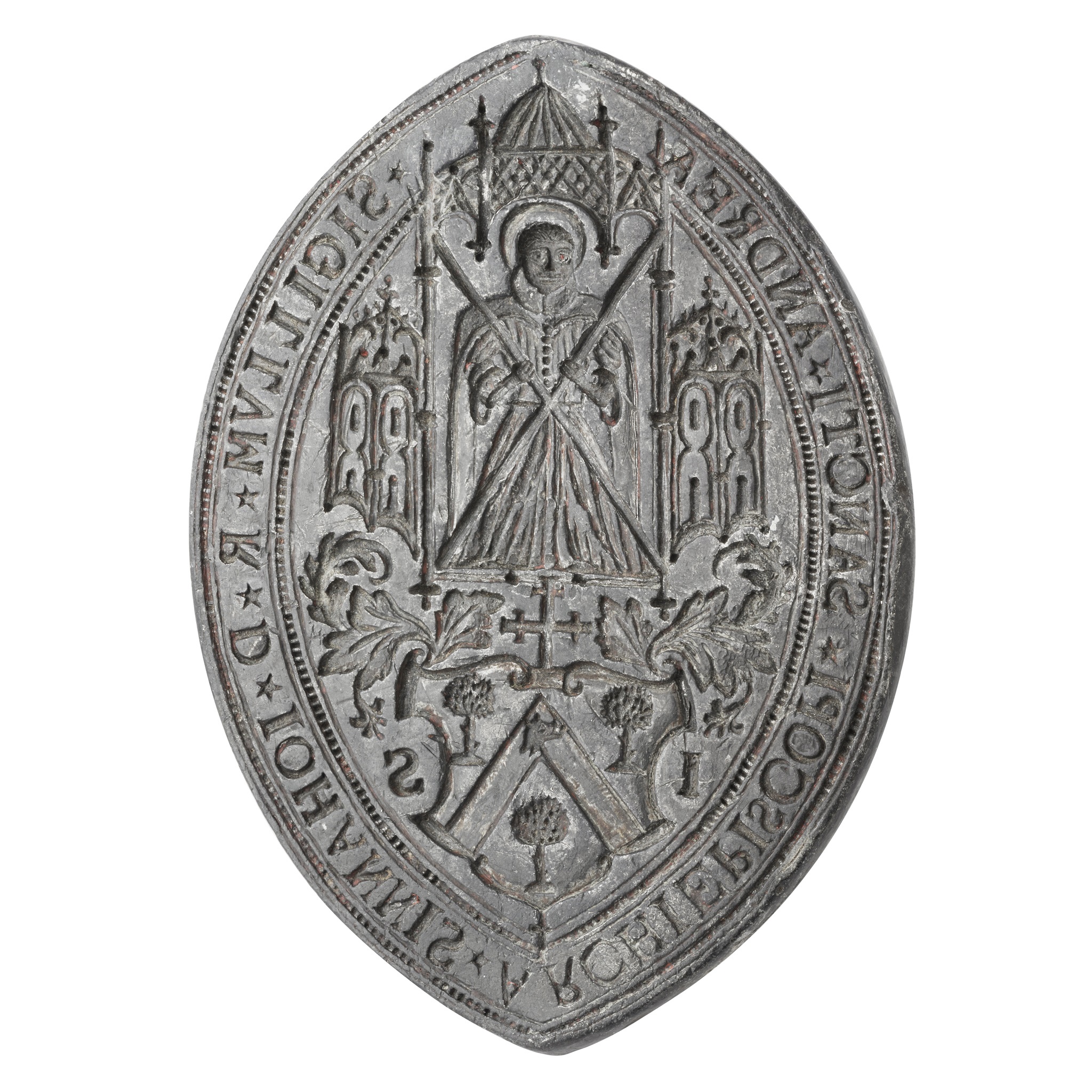 the seal of navette outline, with a depiction of St. Andrew with the Saltire in a border SIGILLVM * R * D * IOHANNIS * ARCHIEPISCOPI * SANCTI * ANDREA, with an integral crescent handle to the reverse