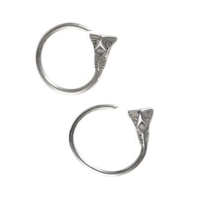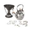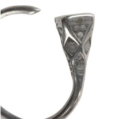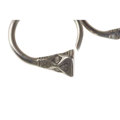 consisting of; a pair of silver bracelets with elkiss decoration, three pairs of silver earrings, a tin teapot with applied copper, a charcoal burner, two Tuareg rings and one Wodaabe ring