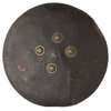 hide shield with four metal bosses, handle on reverse, battle scarred