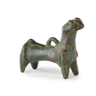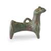 bronze pendant in the form of a standing ram, with suspension loop at the top; mottled green & brown patina