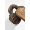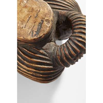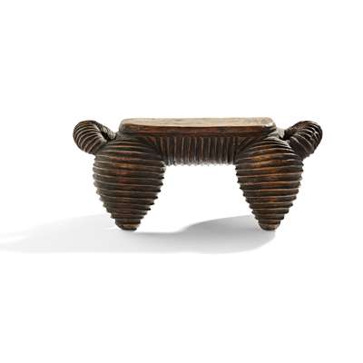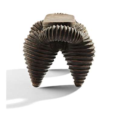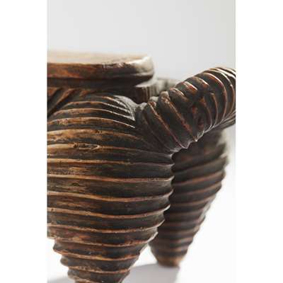 carved wood, evoking the shape of an animal, standing on four sculpted feet with a striated surface