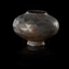 squat pottery urn with incised triangle decoration typical of Urnfield pottery, a glossy dark grey and tan surface