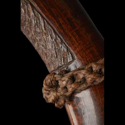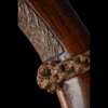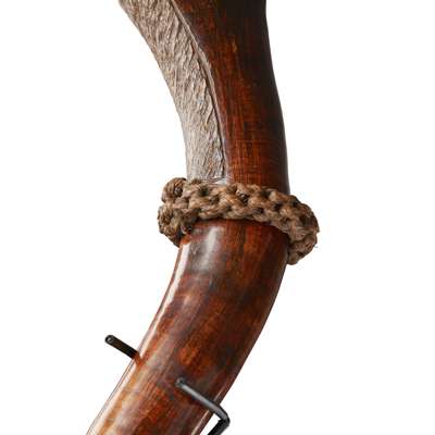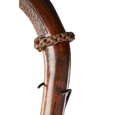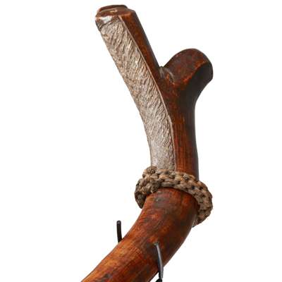 carved wood and fibre, the curved head with rough inner surface and spur to the outer edge, the name "Sailósa" written near the base, mounted