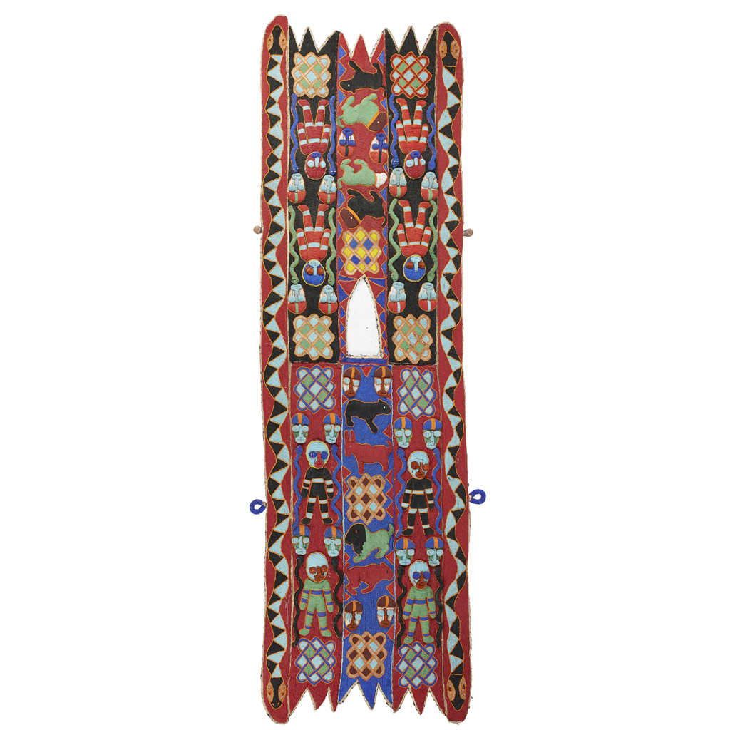 glass beads with linen lining, stylized human and animal figures with geometric decoration throughout