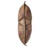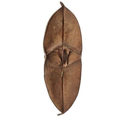 hide, of leaf shaped form, the leather embossed with dotted decoration and red pigment, wooden handle on reverse