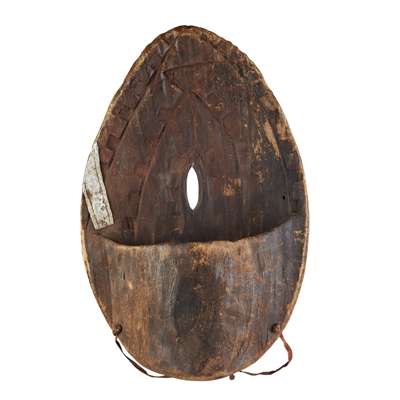 carved wood, leaf shaped shield, metal bush repair on the outer face, the reverse with armhole and incised geometric decoration along the border