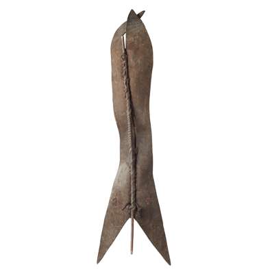 hide, the tall narrow body with overlapping pointed top and fishtail shaped base, with central supporting wooden pole handle