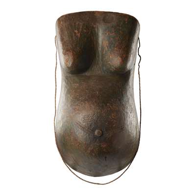 carved wood, modeled in the form of a preganant woman, with scarification marks to the abdomen, incisions for attachment running along the edges