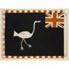 cotton applique flag, a waterbird is shown striding right carrying a fish in its mouth on a blue background, red and white checked border, Union Jack in the top right