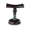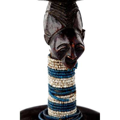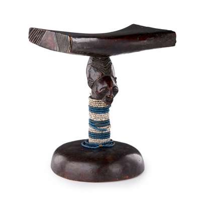 carved wood and beads, the rounded base surmounted by a conical supporting column with beadwork and a face-mask, with curved pillow above