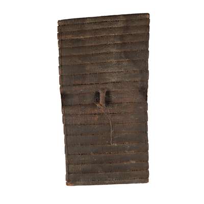 palm bark and rattan weave, rectangular frame with diagonal dent, decorated with a series of painted panels