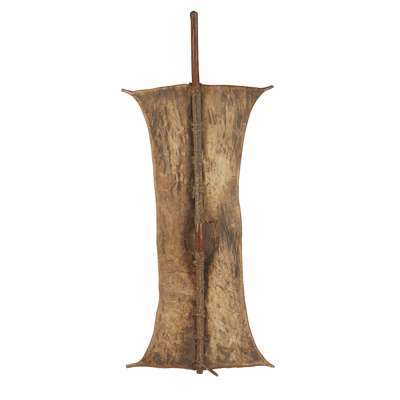 hide, of classic rectangular form, with central wooden shaft and hand grip on the reverse
