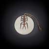 tridacna clam and turtle shell with coconut fibers, the disc-shaped ornament overlain with a filigree of turtle shell representing a frigate bird