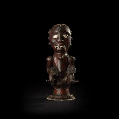 The treatment of the eyes with kaolin as seen in the present example is a relatively rare occurence, see a Ejagham Headress in the Metropolitan Museum of Art, New York (acquisition number 1978.412.607) for similar.