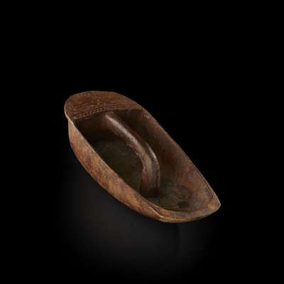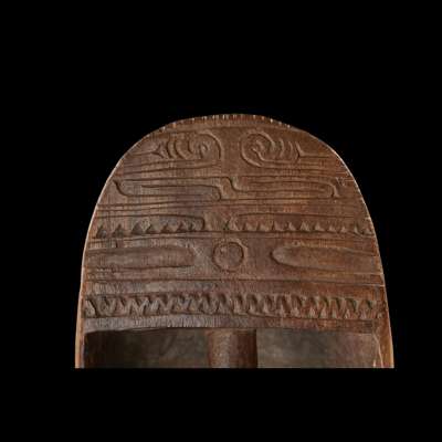 carved wood, of oblong form with central handle and incised decoration on the upper section