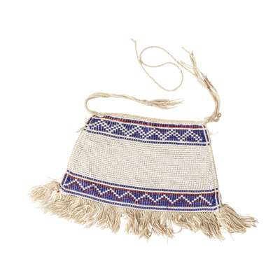 cotton and glass trade beads, with various geometric designs executed in red, blue and white (3)