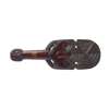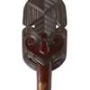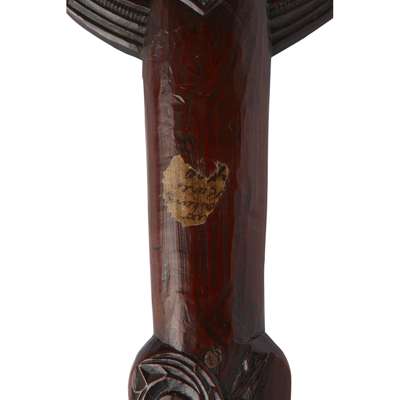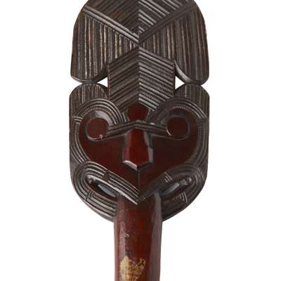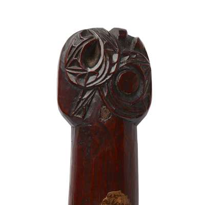 carved wood, the upper blade decorated with a series of segmented incised lines, the lower half a tiki with protruding tonue forming the handle which terminates in the head of a beaked bird, remnants of a late 19th / early 20th century label