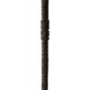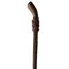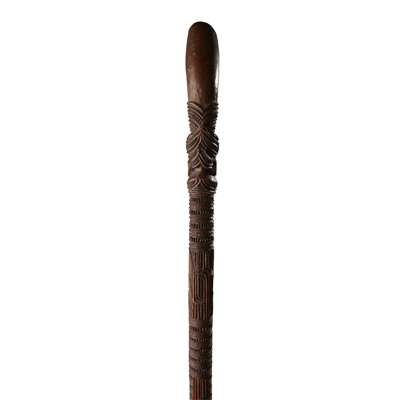 carved wood, with tapering base, intricate geometric carving throughout, with a tiki at the mid section and immediately below the gently curving handle