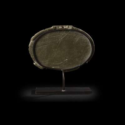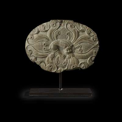 schist, of oval form, with a crouching lion carved in high relief at the centre surrounded by floral decoration