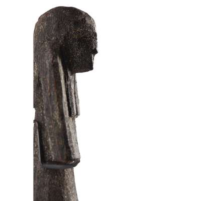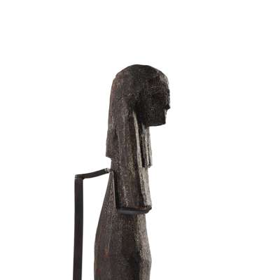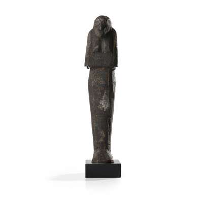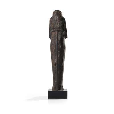 carved wood and pigment, shown mummiform, with long slender body, tripartite wig and folded arms