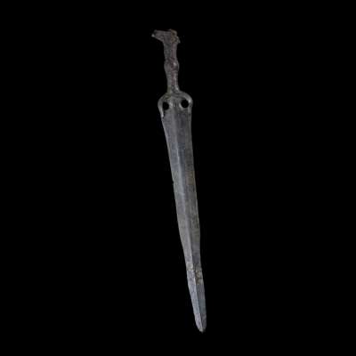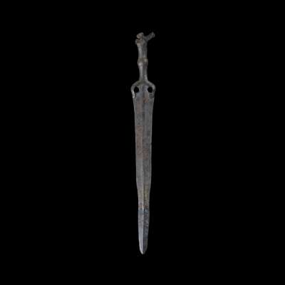 cast and hammered bronze, the tapering blade with subtle midrib, two incisions in the tang form a decorative element at the join with the handle, superb blue-green patina