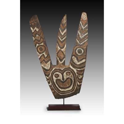 pigment on carved wood, three pronged crest with ancestral face in centre