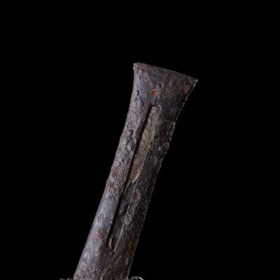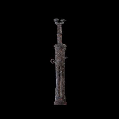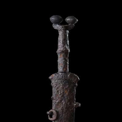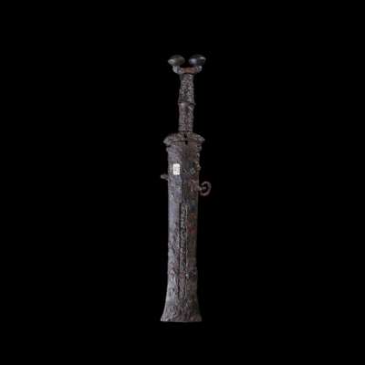 cast iron, the pommel with classic Celtiberian dual antennae design, running down to a handle with midrib, the blade secured within the sheath with flaring end, Axel Guttmann collection label "219"