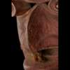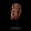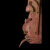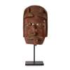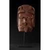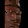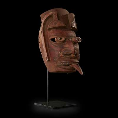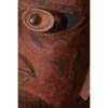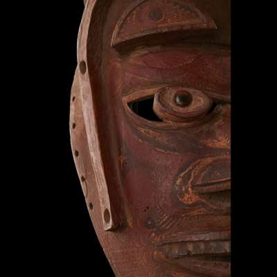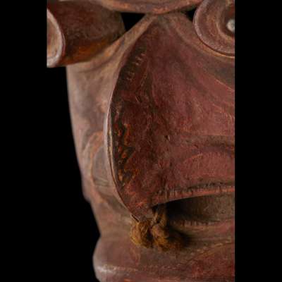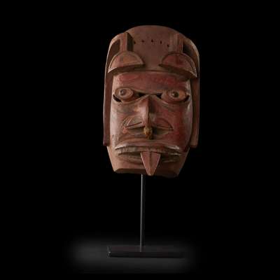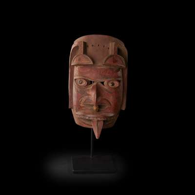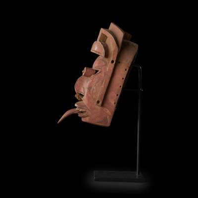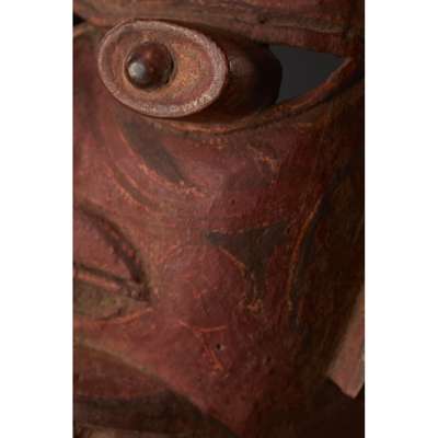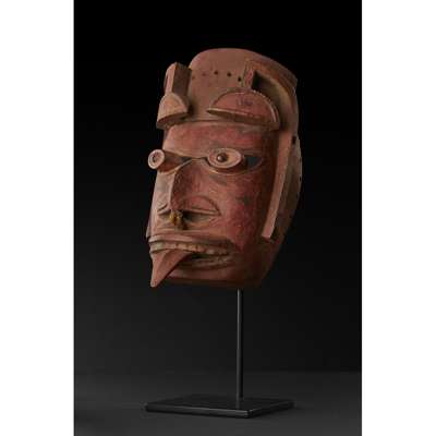 carved wood, pigment, opercula shell and fibre, a rare style, painted in dark red enhancing the confident lines of the face, additional decorative elements painted in orange and black, the eyes projecting forward and inlaid with opercula shell signifying the pupils, the broad nose with remants of fibre attachment in the centre, the mouth baring teeth with protruding tongue, the edges with incisions for the original attachment of the tapa cloth, mounted