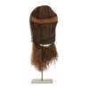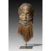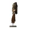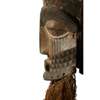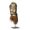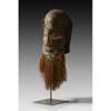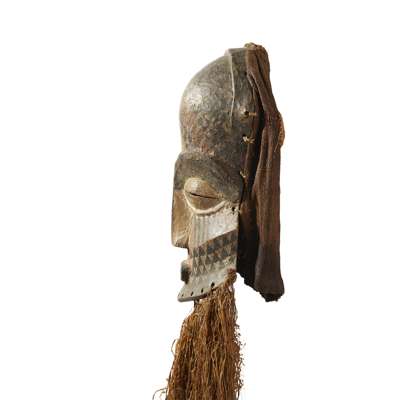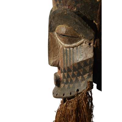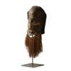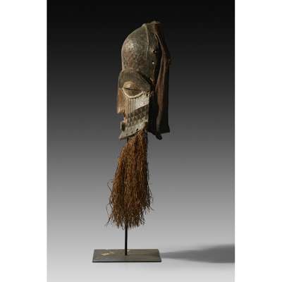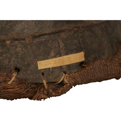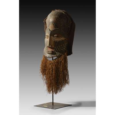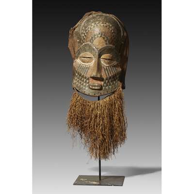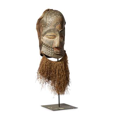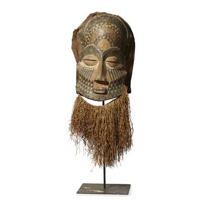 wood, fibre, textile and pigment, with a domed forehead, reccessed coffee bean eyes and closed mouth, fibre beard and textile backing, an old collection label on the top reads "BENA BIOMBO MASK" (sic), mounted
