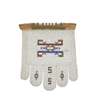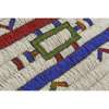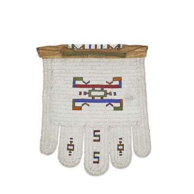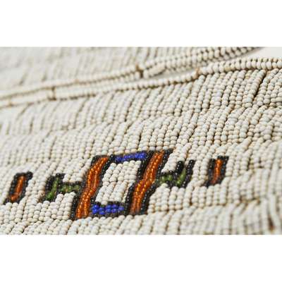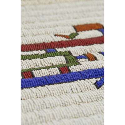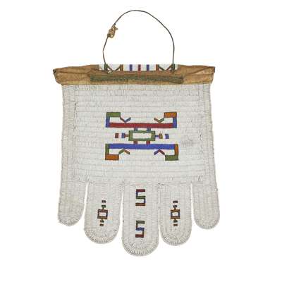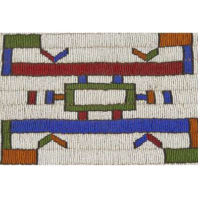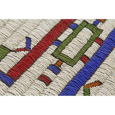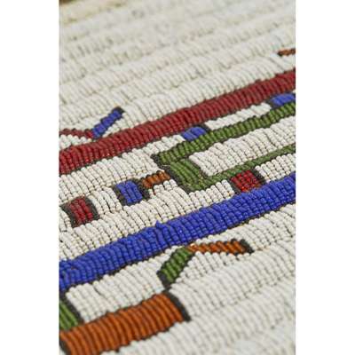 beaded leather, square hide with five flaps at the bottom, decorated with rows of white beads and geometric motifs at the center in multicoloured beads (2)